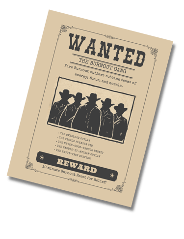You choose which burnout issue – or "outlaw" – feels most present for your team, then pick a time that works for your schedule.